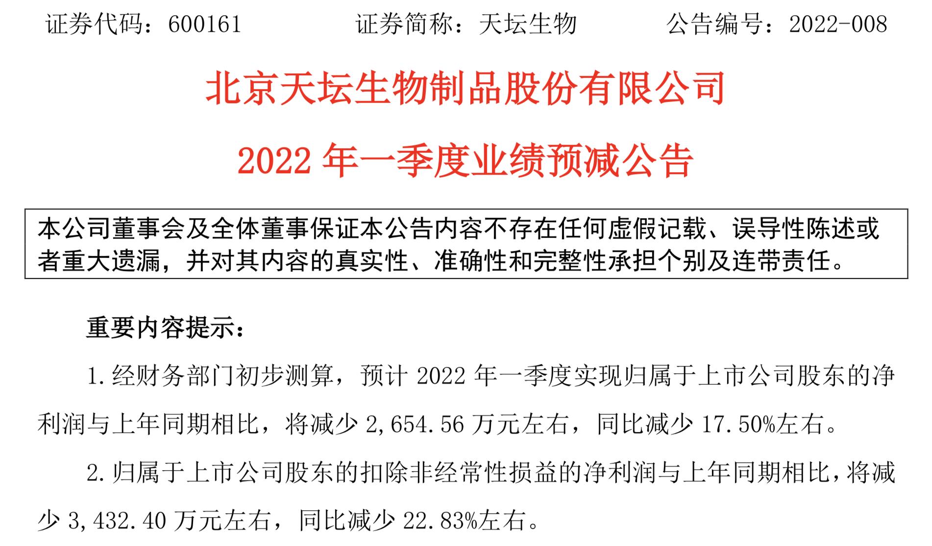 4月9日,天坛生物(600161.SH)发布了2022年一季度业绩预减公告。公告显示,经财务部门初步测算,预计2022年一季度实现归属于上市公司股东的净利润与2021年同期相比,将减少2654.56万元左右,同比减少17.50%左右;归属于上市公司股东的扣除非经常性损益的净利润与2021年同期相比,将减少3432.40万元左右,同比减少22.83%左右。