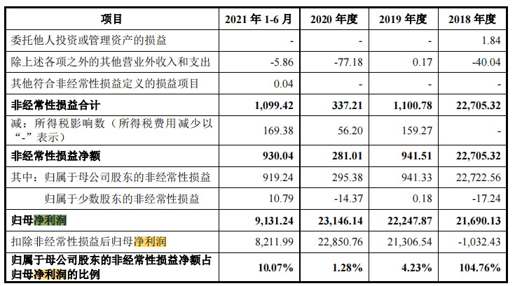 招股书显示,2018-2022年上半年(下称“报告期”),丛麟环保归属于母公司股东的非经常性损益净额分别为22722.56万元、941.33万元、295.38万元、919.24万元,占归母净利润的比例分别为104.76%、4.23%、1.28%、10.07%;扣除非经常性损益后的归母净利润分别为-1032.43万元、21306.54万元、22850.76万元、8211.99万元。