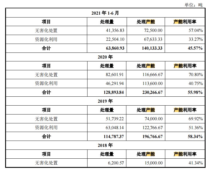报告期内,丛麟环保无害化处置和资源化利用的综合产能利用率分别为27.56%、58.34%、55.95%、45.57%。但是,如果募投项目建成后,将新增超70万吨/年的产能,以其现在的处理量来看,能否消化如此大的产能还是未知数。