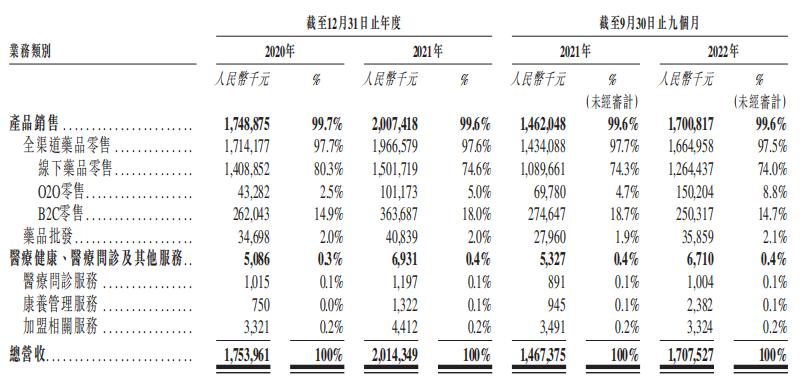 德生堂表示,以整合全方位产品及服务可满足客户涵盖整条医疗卫生产业链全购买周期的医、药、养、保等要素的全链路健康管理需求,但其实际营收仍以药品零售批发为主,医疗问诊、康养管理等相关业务对业绩的贡献很小。