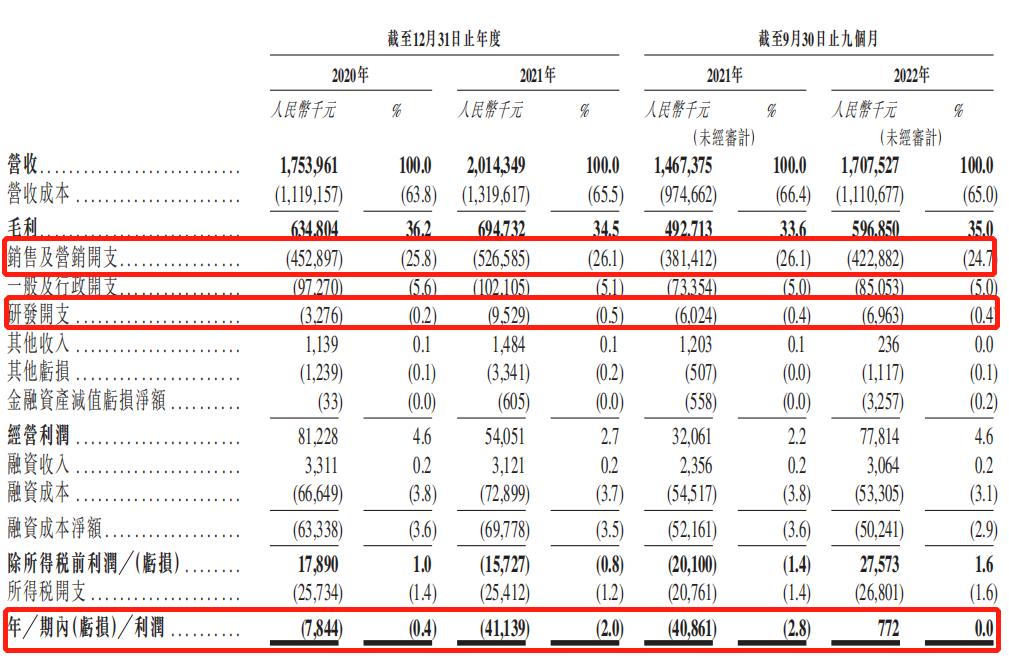 德生堂销售及营销费用攀升,2020年、2021年、2022年前9个月,德生堂的销售及营销开支分别为4.53亿元、5.27亿元、4.23亿元。