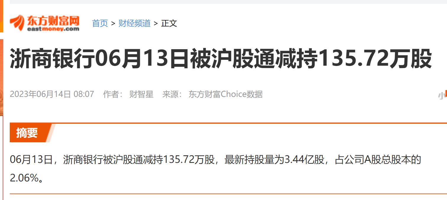 2023年6月12日,浙商银行的A股配股方案获得通过。据据东方财富Choice数据,6月13日,浙商银行被沪股通减持135.72万股。6月13日,沪股通持有浙商银行3.44亿股,占浙商银行总股本的2.06%。