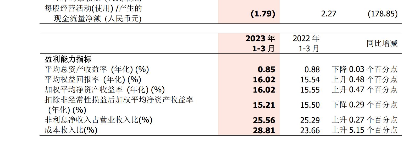 不过,浙商银行4月份公布的2023年第一季度报告显示,其盈利能力关键指标平均总资产收益率相比2022年一季度下降0.03%。与此同时,其成本收入比正在增加,相比2022年一季度增长5.15%,这说明浙商银行的盈利能力正在逐步下降。