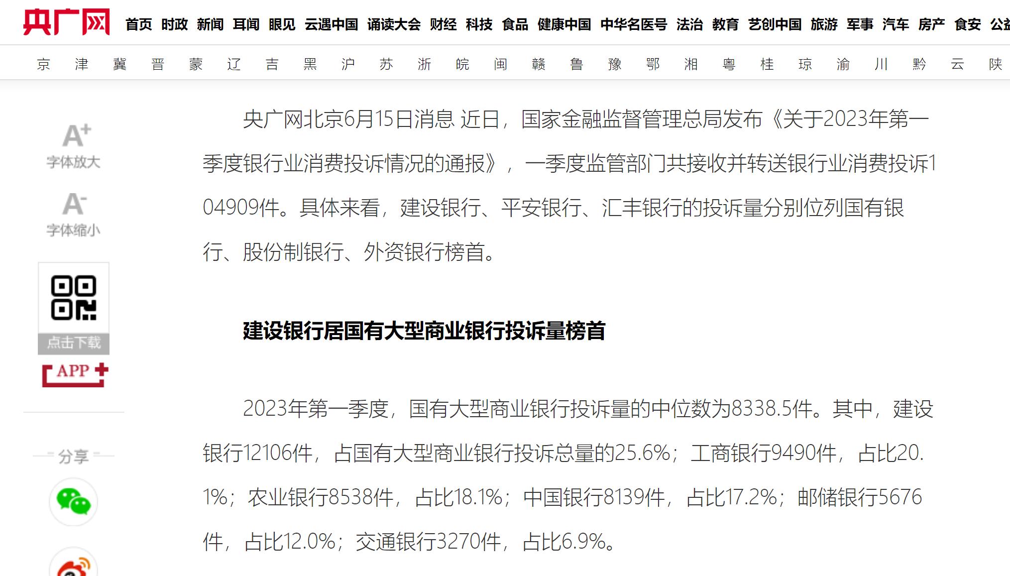 2023年6月15日,据央广网报道,据国家金融监督管理总局发布《2023年第一季度银行业消费投诉情况的通报》显示,在2023年一季度,监管部门接受到的银行业投诉显示,建设银行在国有大型商业银行当中可谓位居榜首。