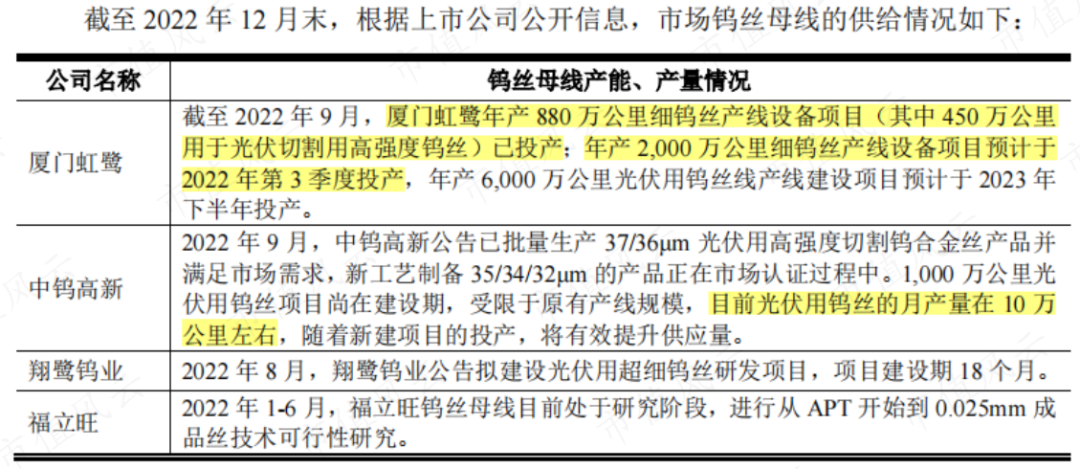 聚焦这两个厂商,厦门钨业的钨丝母线产能要远高于中钨高新,可以说是最核心的钨丝母线供应商。