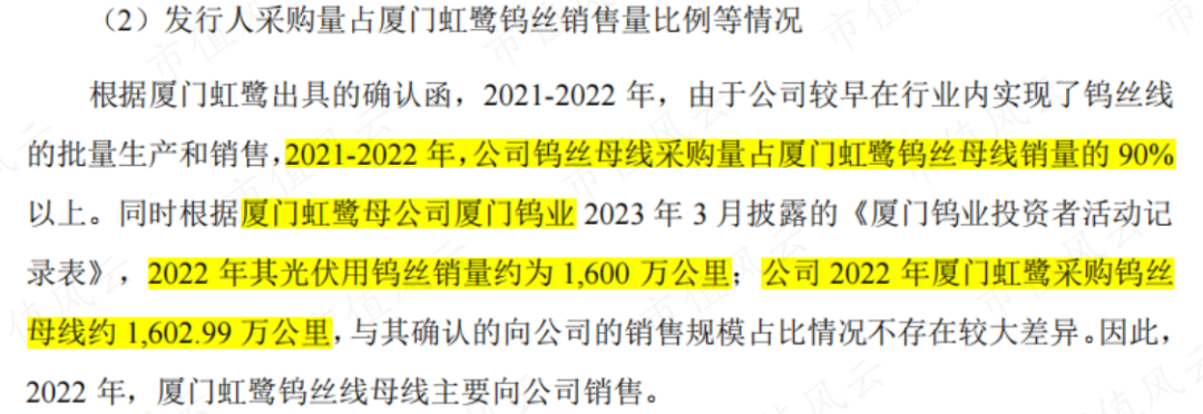 2021-2022年,聚成科技钨丝母线采购量占厦门虹鹭(厦门钨业子公司)钨丝母线销量的90%,基本算是称霸了钨丝母线市场供应量。