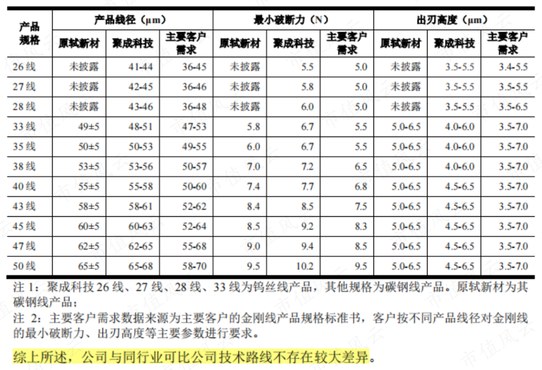 除此之外,在破断力、出刃高度等参数上,聚成科技的钨丝线与同业的碳钢线也没有拉开明显差距。