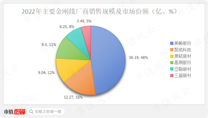 此时,再谈聚成科技在钨丝线市场的90%占有率,意义实属不大。不如放眼金刚线全市场——2022年聚成科技的市占率约为16%。