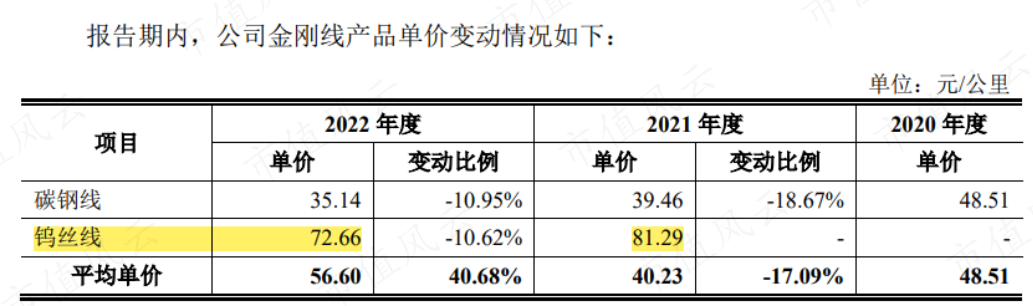 2021年,作为金刚线产品迭代下的新产物,钨丝线的毛利率甚至比传统碳钢线还要略低3个百分点。2022年,面对碳钢原料涨价7.72%,二者的毛利率才基本持平在36.4%。