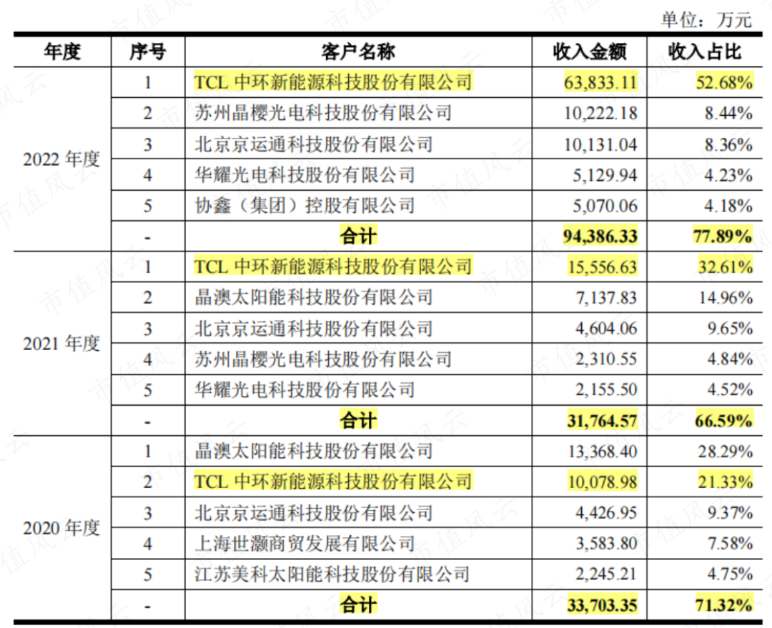 TCL中环(002129.SZ)是聚成科技钨丝线的最大客户,采购金额达6.03亿,另采购碳钢线3,559万,整体占到公司营收的52.68%。