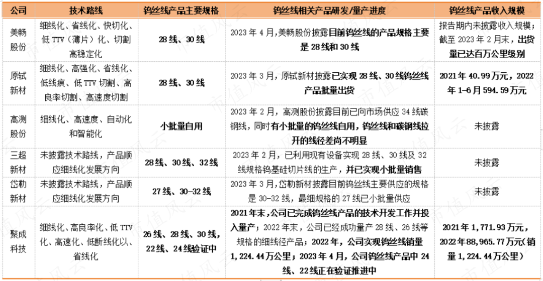 如今,已有不少金刚线厂商着手布局钨丝线,除了聚成科技以外,还有美畅股份(300861.SZ)、高测股份(688556.SH)、三超新材(300554.SZ)等。