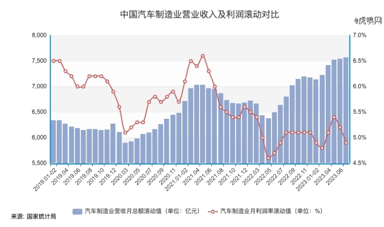 就以2019年至今的国家统计局“汽车制造业”经营状况统计值(经过相应的年化滚动值处理,凸显变化趋势)为例,汽车制造业的营收和利润持续表现为相反的变化趋势。3年时间里(2019年7月和2023年7月对比),营业收入增长了23%,利润仅增长了0.6%,换算而来的利润率下滑了足足23%。