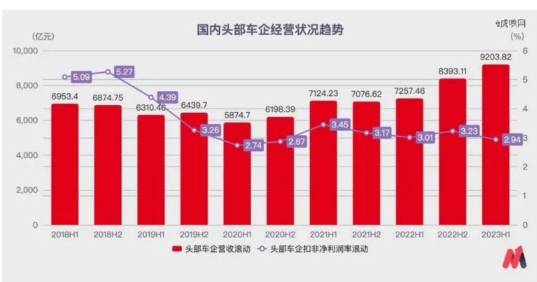 以国内去年乘用车市场总体占比超50%的6家头部车企(均为上市企业),比亚迪、吉利汽车、长城汽车、上汽集团、长安汽车、广汽集团的合并经营状况为例。从2018年至今,其营收规模增长了超过30%,利润反而下降了37%,相当于利润率下滑了42%。