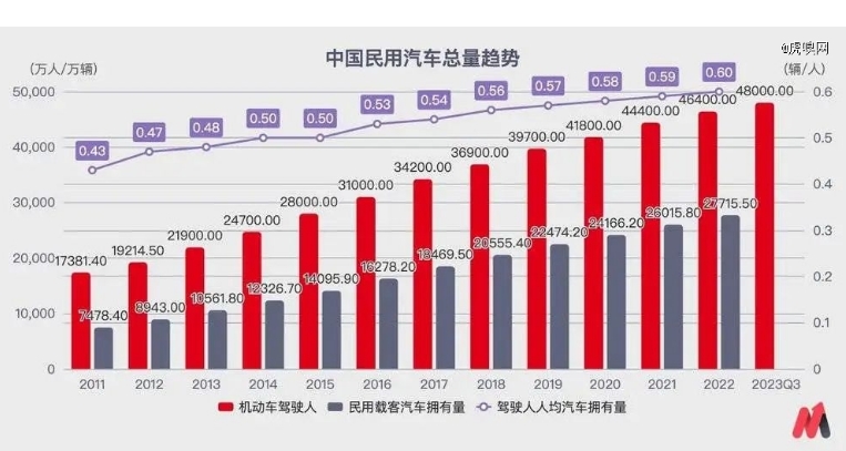 这一趋势,其实可以从很多宏观的统计数据看出。首先是中国民用汽车的保有量增长趋势,截至2022年底,国内机动车驾驶人总数达4.64亿人,对应的民用载客汽车保有量为2.77亿辆。从驾驶人人均汽车拥有量出发,近10年来已经从0.47辆/人,上升到了0.6辆/人。