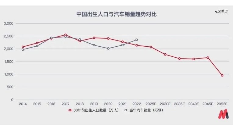 不仅2014-2018年的曲线高度重合,就连2019年之后疫情影响,以及新能源技术革命的趋势都高度吻合。真正关键的在于未来,已知国内1992年后出生人口的持续下降,哪怕去年首次跌破1000万的出生人口数字,很可能要到2052年前后才会真正产生影响,但中国汽车本土市场向存量、总量持续萎缩模式转型的趋势已经确立。