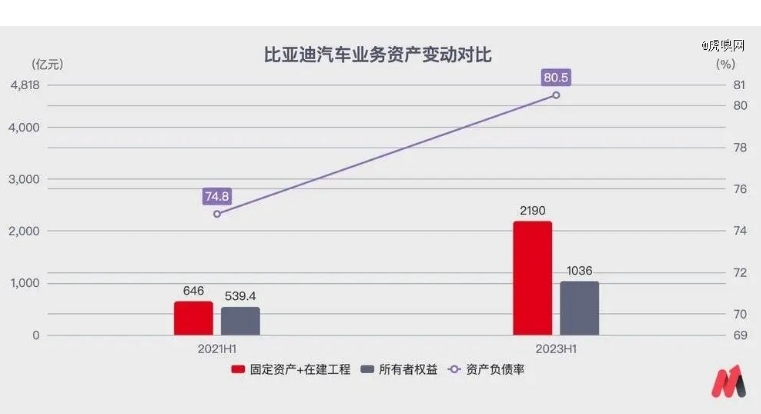 极低的利润水平之下,比亚迪还在自身所有者权益仅增长了不到500亿元的前提下,比亚迪在生产的厂房和设备等固定资产上,新增了超过1500亿元的投资,一口气将自己的资产负债率抬升到了超过80%的水平。