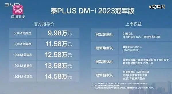 比亚迪A级乘用轿车“销售王”的秦Plus DM-i上市之初,起售价格仅为12万,主要的对比对象还是20万的合资车型。今年2月比亚迪首先在秦PLUS DM-i上推出“冠军版”,在产品配置基本不变的情况下,直接将价格杀到了10万元以内。