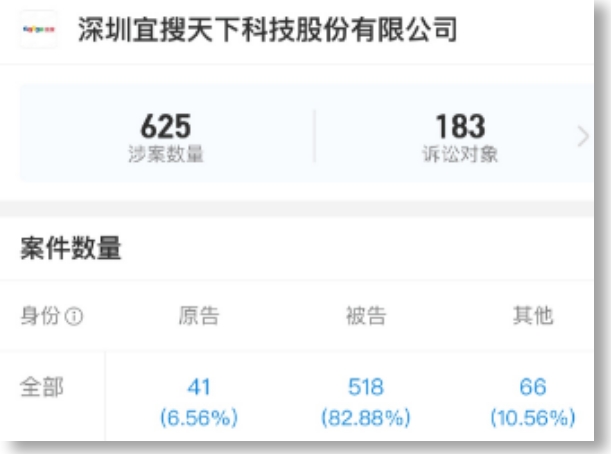 根据企查查,截至10月15日,深圳宜搜天下科技有限公司(主要运营实体)共有625起司法案件。其中,82.88%为被告;2019年的案件占比最高,为73.08%。