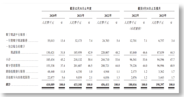 从收入结构看,包含广告的数字阅读服务加上数字营销服务,二者合计占2022年收入的92.2%。同年,付费阅读服务仅占5.4%。2023年前五个月,广告收入更是达到了93.2%