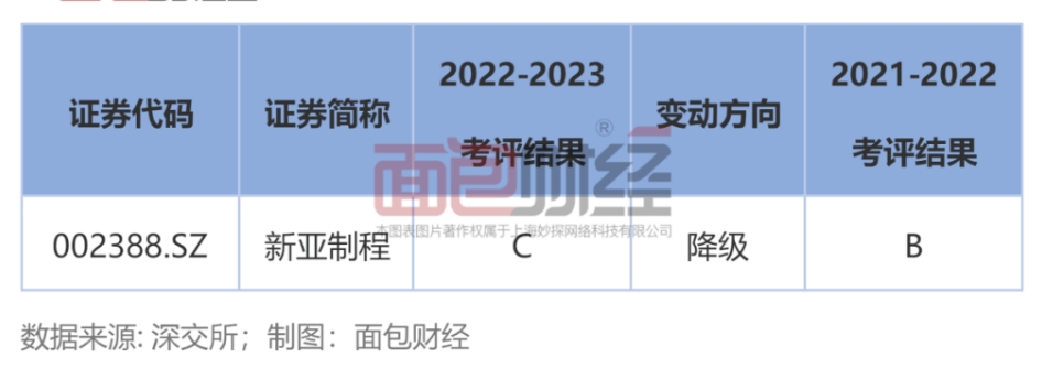 数据显示,2022-2023年度,新亚制程信息披露考评的评价结果被降级为C。