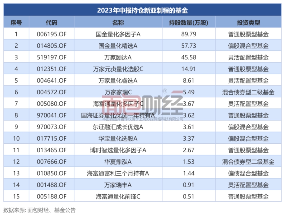 公开资料显示,2023年二季度末有19只基金持仓新亚制程,剔除指数型产品后共有15只基金。