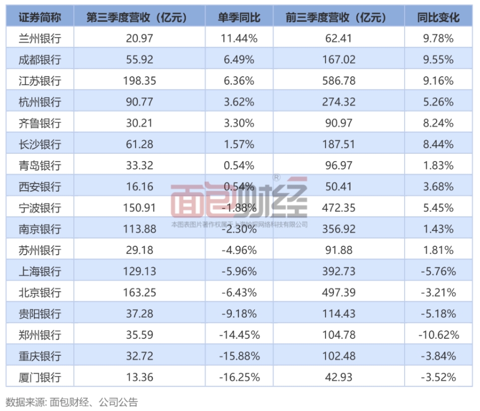 第三季度营收:兰州银行增长快,重庆银行、厦门银行降幅大