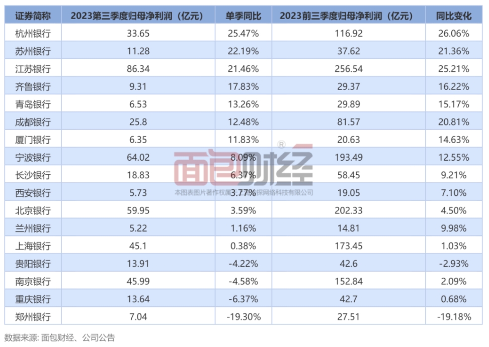 第三季度归母净利润:杭州银行、苏州银行、江苏银行增速居前三