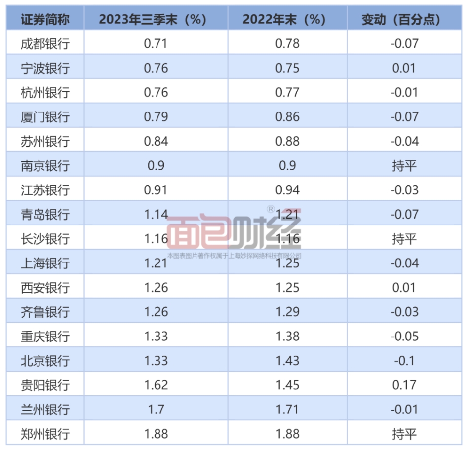 面包财经梳理财报信息发现,17家上市城商行的不良贷款率情况保持良好。截至2023年三季末,共计7家银行的不良贷款率维持在1%以下,其中,成都银行的不良贷款率为0.71%排名第一,其次是宁波银行和杭州银行,不良贷款率均为0.76%。