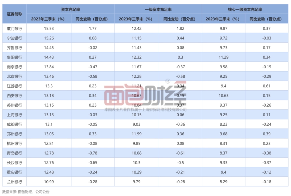 数据显示,截至2023年9月末,17家上市城商行的资本充足率较上年末相比普遍出现下滑。