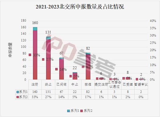 IPO参考通过整理市场数据发现,北交所自开市以来至2023年11月24日,累计受理上市申报企业共有479家,注册及核准通过的企业共计242家,合计通过率约为50%;终止企业共计为131家,占比约为27%。
