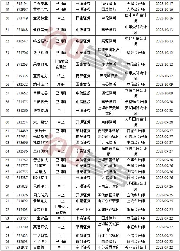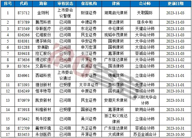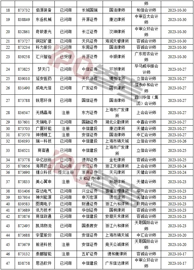 根据北交所公开数据的不完全统计,截至11月20日,北交所排队在审的企业有116家,包括处于受理阶段的6家、问询阶段56家(已问询16家、一轮问询回复7家、二轮问询11家、二轮问询回复13家、三轮问询8家、三轮问询回复4家、四轮问询2家、四轮问询回复2家)、暂缓审议2家、过会2家、中止29家、提交注册8家、注册生效5家、发行中1家。