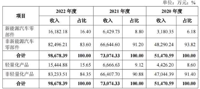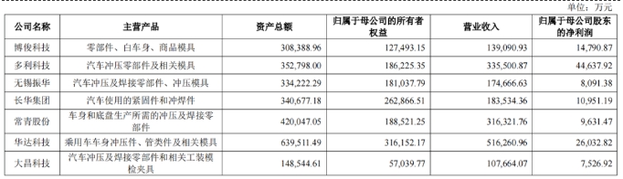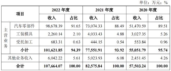 大昌科技汽车零部件收入分别为5.147亿元、7.307亿元和9.868亿元,占比分别为89.51%、88.49%和91.65%。此外为工装模具业务,占比为个位数。