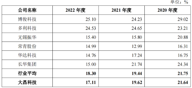 报告期内,公司综合毛利率分别为21.64%、19.62%和17.11%。与可比同行均值相比,较为相近。