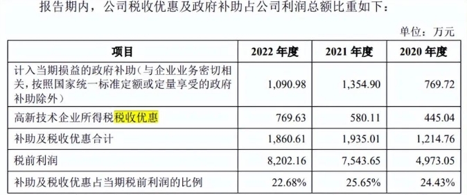 2020年-2022年,大昌科技其他收益分别为774.16万元、1,284.26万元和432.03万元,占公司利润总额的比例为15.57%、17.02%和5.27%,主要为与日常经营活动相关的政府补助。报告期高新技术企业所得税税收优惠分别为445.04万元、580.11万元和769.63万元,补助及税收优惠合计分别为1,214.76万元、1,935.01万元和1,860.61万元,补助及税收优惠占当期税前利润的比例分别为24.43%、25.65%和22.68%。