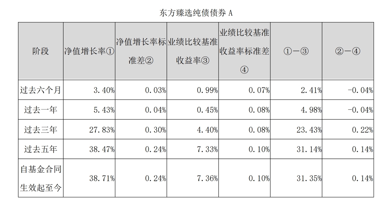 东方臻选纯债债券型证券投资基金A2018年-2022年各会计年度净值增长率分别为1.11%、4.94%、2.90%、15.91%、4.25%,同期业绩比较基准收益率分别为2.94%、1.10%、-0.16%、2.28%、0.19%。