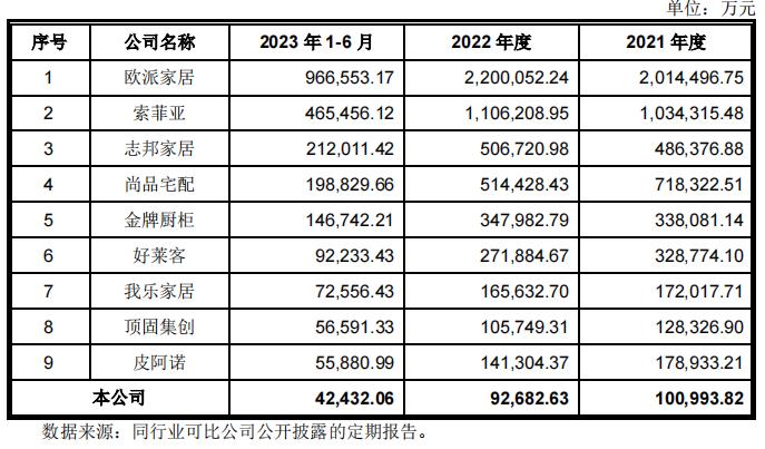 在申报稿中,玛格家居将欧派家居、索菲亚、志邦家居、尚品宅配、金牌橱柜、好莱客等9家公司列为同行业主要竞争对手。不过,与同行业公司进行主营业务收入对比过程中,玛格家居始终处于垫底的角色,不及行业龙头欧派家居的二十分之一。