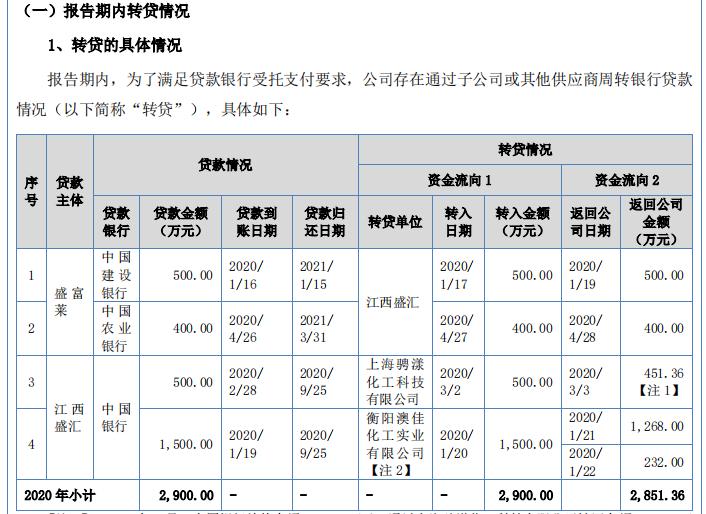 此外,转贷行为在2020年就已经被禁止,但是在2020年1月、2月、4月,盛富莱进行了4次转贷,金额共计2900万元,但是返回到盛富莱的金额是2851.36万元,相差48.64万元。盛富莱称,2020年2月,中国银行放款金额500.00万元,通过上海骋漾化工科技有限公司转回金额451.36万元,转回差额48.64万元,转回差额为受托支付供应商的预付采购款,差额部分具有真实业务背景,不属于转贷行为。即使如此,选在2020年中国人民银行的规定时间线上进行大规模转贷,是否突击转贷?