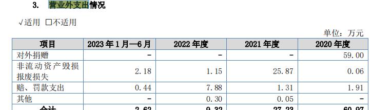 2020-2023年上半年,盛富莱营业外支出分别为60.97万元、27.23万元、9.32万元和2.62万元,主要为对外捐赠、固定资产报废损失等,其中,赔、罚款支出分别为1.91万元、1.31万元、7.88万元、0.44万元。到底因为什么被赔款、罚款没有介绍。
