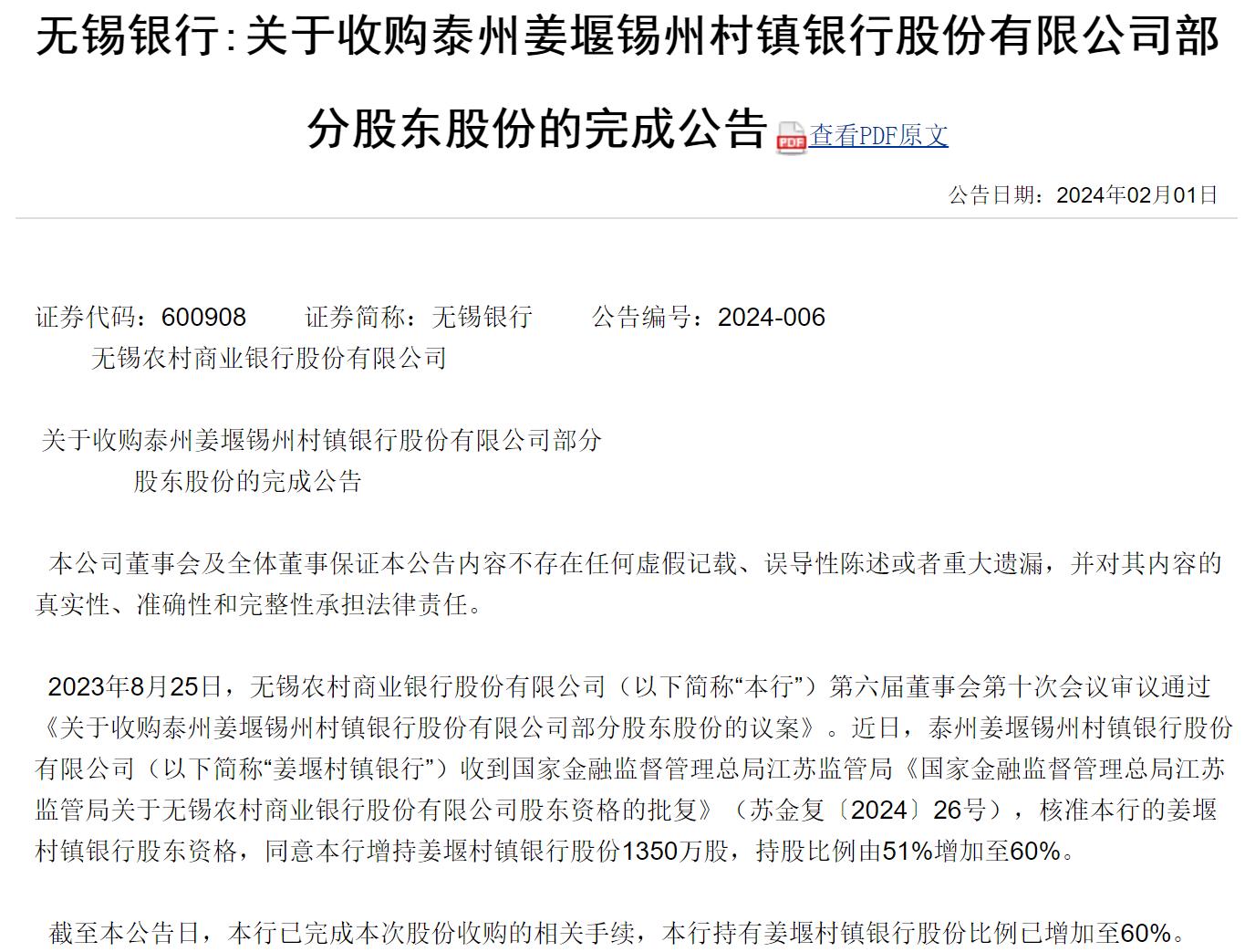 无锡银行2011年发起设立泰州姜堰锡州村镇银行,持有该行7650万股,在近期继续增持姜堰村镇银行1350万股后,完成对该行的绝对控股。但村镇银行面临比较大的竞争压力,同时需要满足合规要求,在净息差持续下调的背景下,村镇银行发展经营压力并不小。