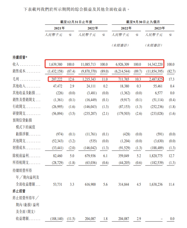 招股书显示,2021年至2023年前三季度,钧达股份收入分别为16.39亿元、110.86亿元、143.42亿元,毛利分别为2.07亿元、12.15亿元、24.88亿元。对比2021前三季度2.34亿元的营收,堪称脱胎换骨。
