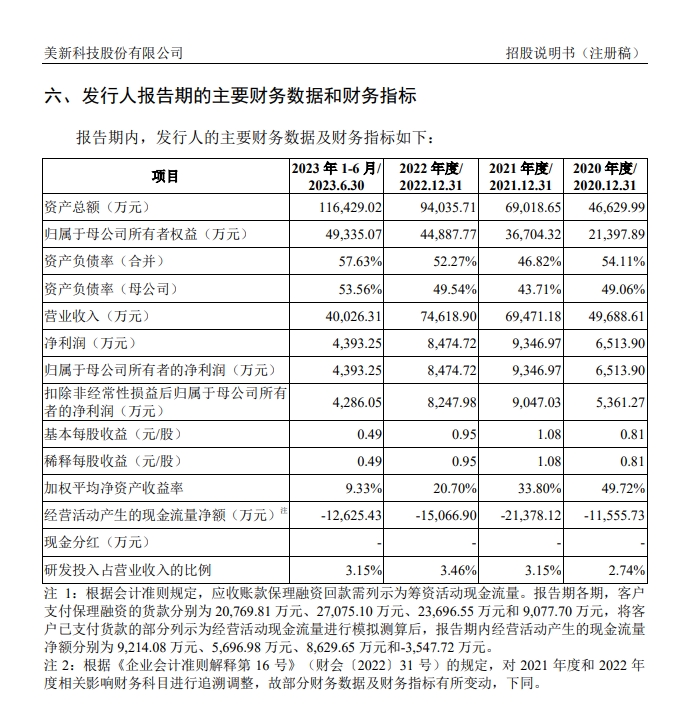 招股书显示,2020年至2023年上半年,美新科技营业收入分别为4.97亿元、6.95亿元、7.46亿元、4.00亿元,扣非净利润分别为5361.27万元、9047.03万元、8247.98万元、4286.05万元。