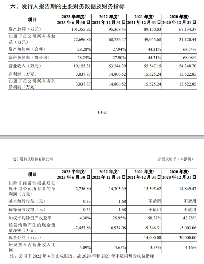 业绩方面,2020年至2023年上半年,道尔道营业收入分别为5.43亿元、5.55亿元、5.32亿元、1.92亿元,归母净利润分别为1.55亿元、1.55亿元、1.48亿元、3037.87万元。