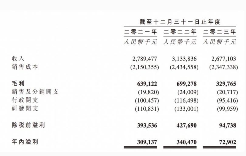 业绩方面,2021年至2023年,武汉有机收入分别为27.89亿元、31.34亿万元、26.77 亿元,年内溢利分别为3.09亿元、3.40亿元、7290.2万元,对应毛利率分别为22.9%、22.3%、12.3%,盈利空间持续收窄。