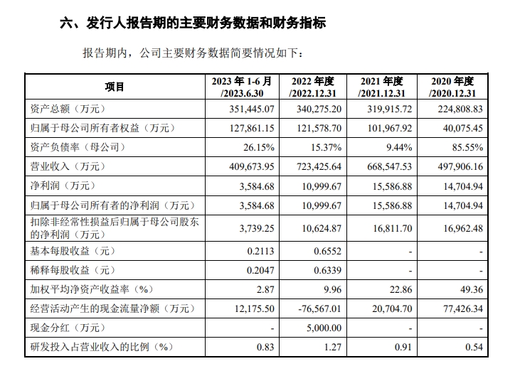 业绩方面,2020年至2023年上半年,深蕾科技的营业收入分别为49.79亿元、66.85亿元、72.34亿元、40.96亿元,归母净利润分别为1.47亿元、1.55亿元、1.09亿元、3584.68万元,2022年净利润同比下滑。
