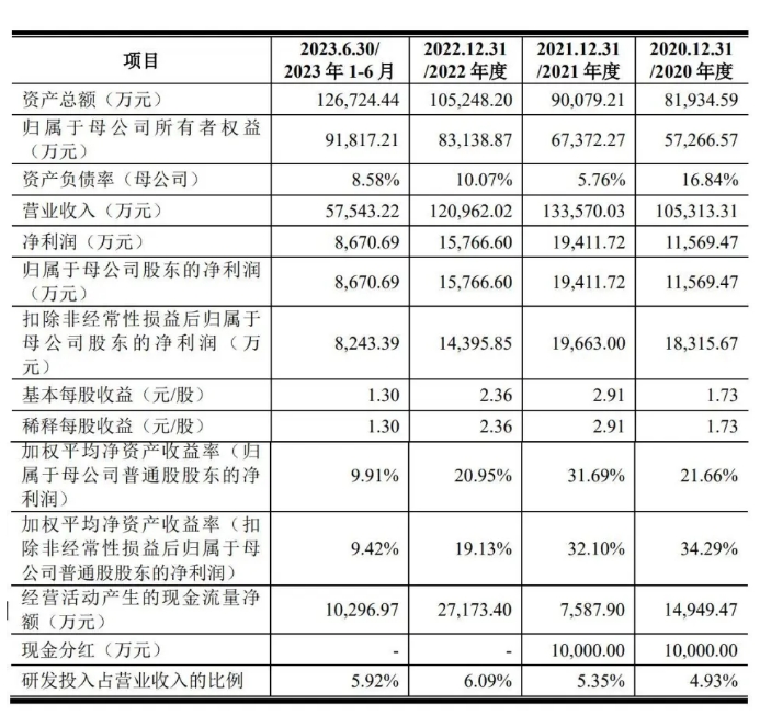 业绩方面,2020年至2023年上半年,博实结营收分别为10.53亿元、13.36亿元、12.1亿元、5.75亿元,扣非净利润分别为1.83亿元、1.97亿元、1.44亿元、8243.39万元。