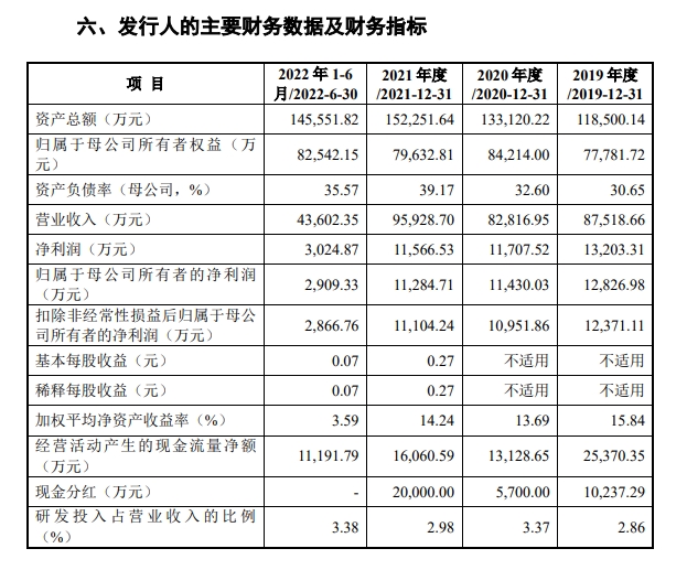 业绩方面,2019年至2022年上半年,敏达股份营业收入分别为8.75亿元、8.28亿元、9.59亿元、4.36亿元,净利润分别为1.32亿元、1.17亿元、1.16亿元、3024.87万元,2022年上半年净利润明显下滑。
