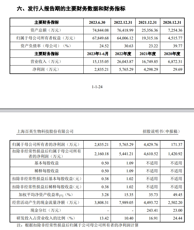 业绩方面,2020年至2023上半年,百英生物的营业收入分别为6872.31万元、1.67亿元、2.60亿元、1.51亿元,归母净利润分别为171.37万元、4429.76万元、5765.29万元、2835.21万元,综合毛利率分别为76.66%、73.72%、65.88%、64.24%,逐年下滑。