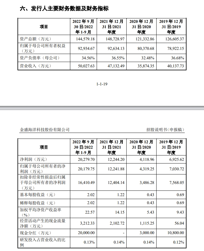 业绩方面,2019年至2022年前三季度,金盛海洋的营收分别为4.01亿元、3.59亿元、4.71亿元、5.00亿元,扣非净利润分别为7568.05万元、3486.28万元、1.24亿元、1.64亿元。
