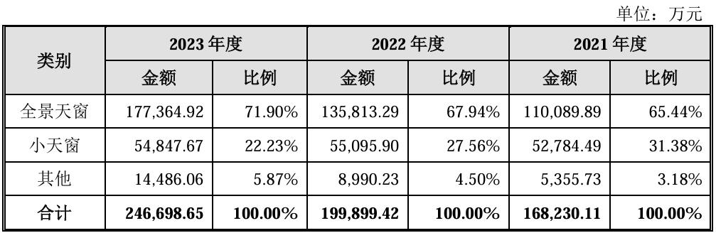 报告期内,毓恬冠佳的主营业务收入主要来源于全景天窗和小天窗的销售。全景天窗和小天窗收入合计分别为162,874.38万元、190,909.19万元和232,212.59万元,占主营业务收入的96.82%、95.50%和94.13%。2021年至2023年,公司主营业务收入复合增长率为21.10%,其中全景天窗销售收入复合增长率为26.93%,小天窗销售收入复合增长率为1.94%。此外公司通过优化产品结构,提升产品附加值,实现了业绩的快速增长,更进一步证明了公司的成长性和市场潜力。
