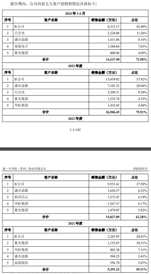强一股份的前五大客户销售占比集中度高,在报告期内分别是49.11%、62.28%、75.91%和72.58%。尤其是对B公司的依赖较重,销售收入占比分别是25.14%、50.29%、67.47%和70.79%。